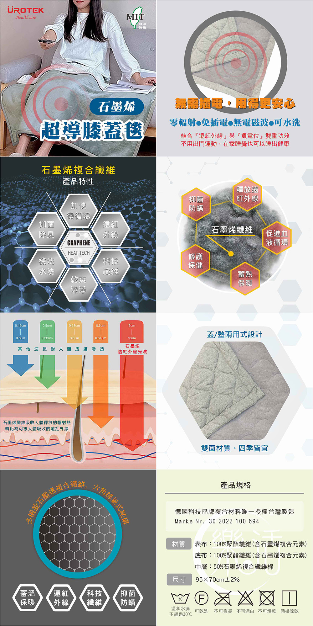 1. 石墨烯超導機能面料,雙面蓋墊兩用材質(平織/刷毛),舒適控溫2. 自然釋放遠紅外線,免插電,零輻射、零電磁波3. 抑菌消臭,有效避免細菌滋生4. 可放洗衣袋後機洗,衛生又便利5. 100%台灣製造