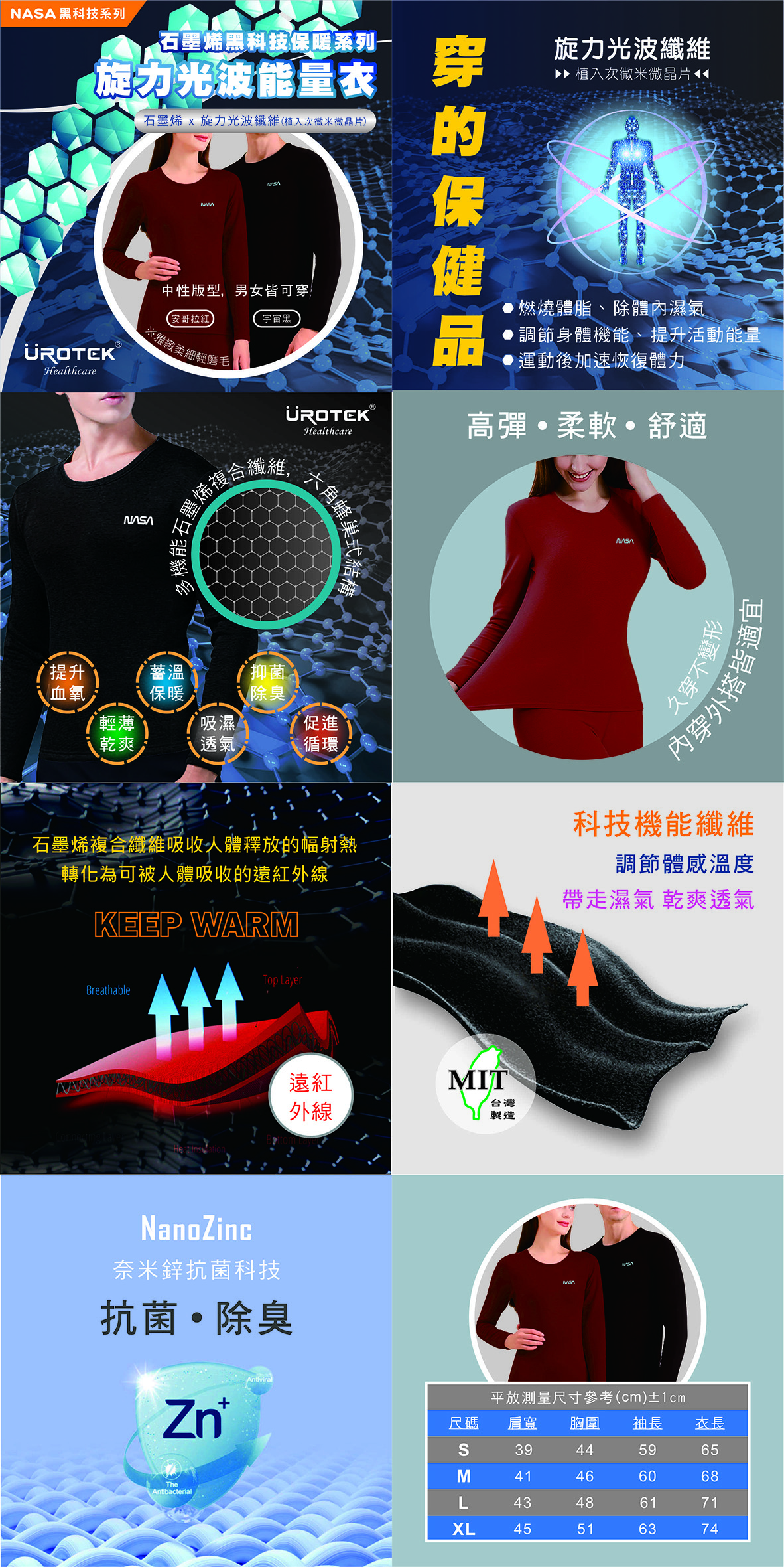 1. 新開發石墨烯旋力光波能量纖維,調節身體機能,提升活動續航力,減緩疲勞產生2. 石墨烯自然釋放遠紅外線波,遠紅外線波可促進血液循環3. 吸濕快乾,抑菌消臭,抗UV,恆溫舒適不悶熱4. NASA授權設計,100% 台灣製造