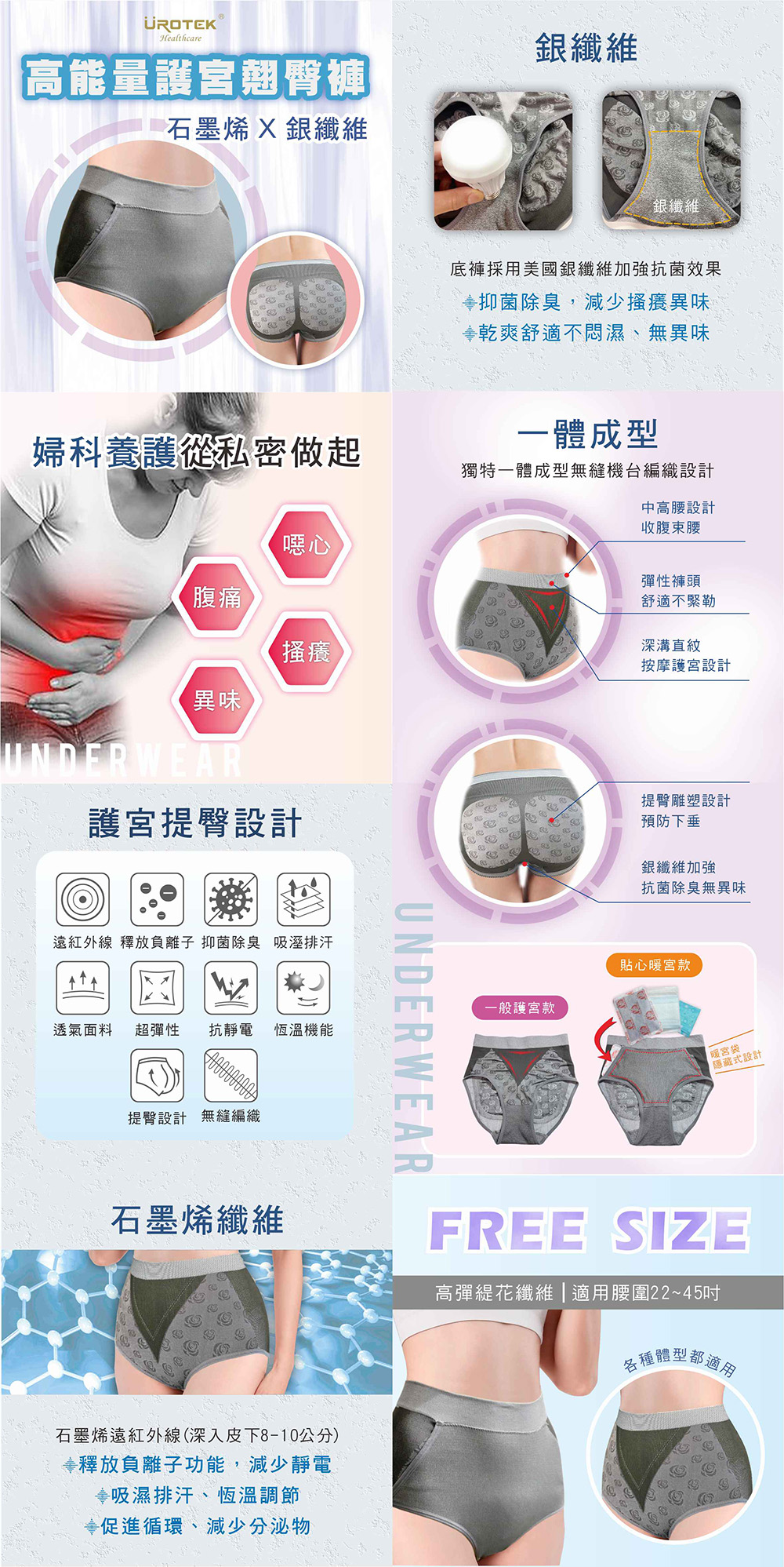 1. 翹臀護宮加強版,兩側開口設計,可置放貼身物(暖暖包、衛生棉、護墊等)不易掉出2. 一體成形超彈力無縫舒適設計,修身提臀,完美貼合3. 釋放遠紅外線及負離子,抗靜電,降低電磁波4. 吸濕排汗,恆溫舒適不悶熱5. 重點部位採用美國銀纖維,抑菌消臭,維持乾爽舒適及衛生6. 100%台灣製造